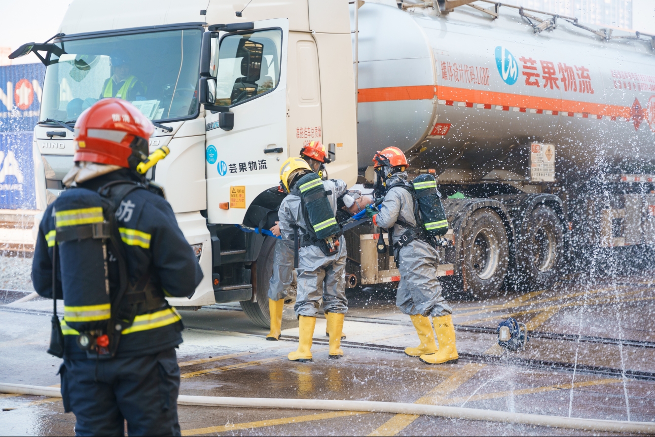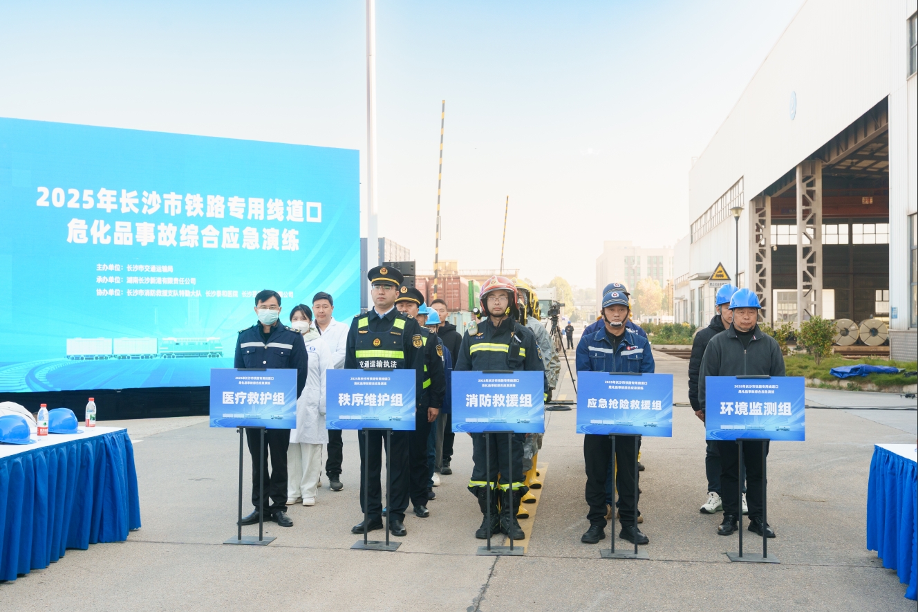 11月21日,2025年長沙市鐵路專用線道口;肥鹿示C合應(yīng)急演練在長沙新港公司舉行,演練由長沙市交通運(yùn)輸局主辦,長沙新港公司承辦,長沙市市生態(tài)環(huán)境局、開福區(qū)消防救援大隊(duì)、長沙泰和醫(yī)院參加。 演練模擬一輛裝有甲醇二甲胺的危化品槽罐車經(jīng)過鐵路道口時(shí),因雨天路滑發(fā)生事故,導(dǎo)致裝載物泄露,一名司乘人員被困車內(nèi),一列火車即將通過道口,情況十分危急。道口值班人員發(fā)現(xiàn)事故后,第一時(shí)間通知車站信號(hào)樓,并緊急采用手旗信號(hào)截停列車,避免發(fā)生二次事故并造成更嚴(yán)重的后果,同時(shí),值班員迅速向長沙新港公司報(bào)告事故情況,包括泄漏罐車的位置、泄漏程度、是否有起火、人員受困或傷亡等信息,長沙新港公司迅速啟動(dòng)應(yīng)急預(yù)案。應(yīng)急救援、警戒疏散等多個(gè)小組攜帶裝備5分鐘內(nèi)集結(jié)完畢,奔赴事故現(xiàn)場處置。隨后,消防救援人員、醫(yī)療救護(hù)人員、環(huán)境監(jiān)測人員等各司其職,聯(lián)合處置了這一起突發(fā)事件。